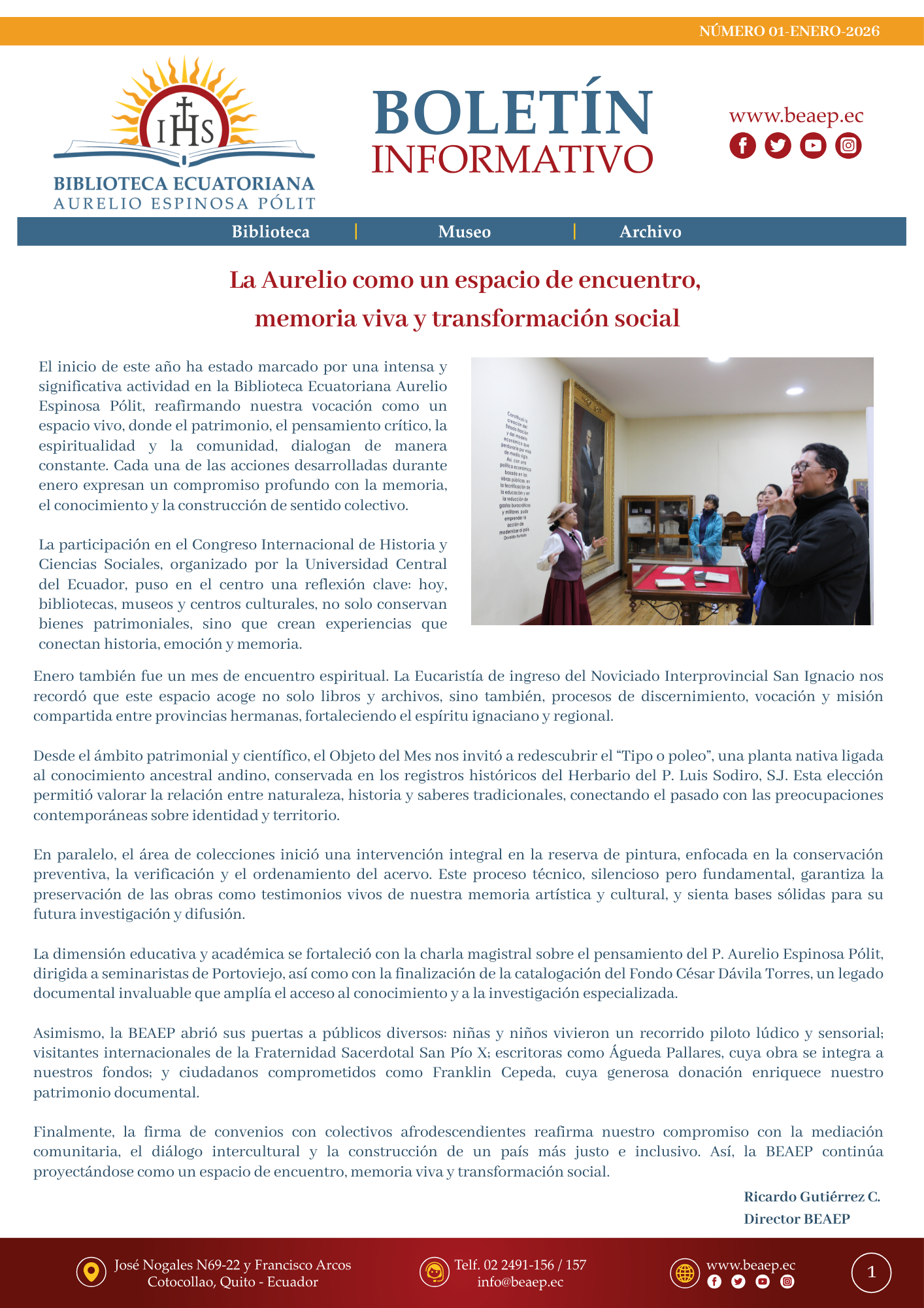 Boletín Enero 2026: El inicio de este año ha estado marcado por una intensa y significativa actividad en la Biblioteca Ecuatoriana Aurelio Espinosa Pólit, reafirmando nuestra vocación como un espacio vivo, donde el patrimonio, el pensamiento crítico, la espiritualidad y la comunidad, dialogan de manera constante. Cada una de las acciones desarrolladas durante enero expresan un compromiso profundo con la memoria, el conocimiento y la construcción de sentido colectivo.